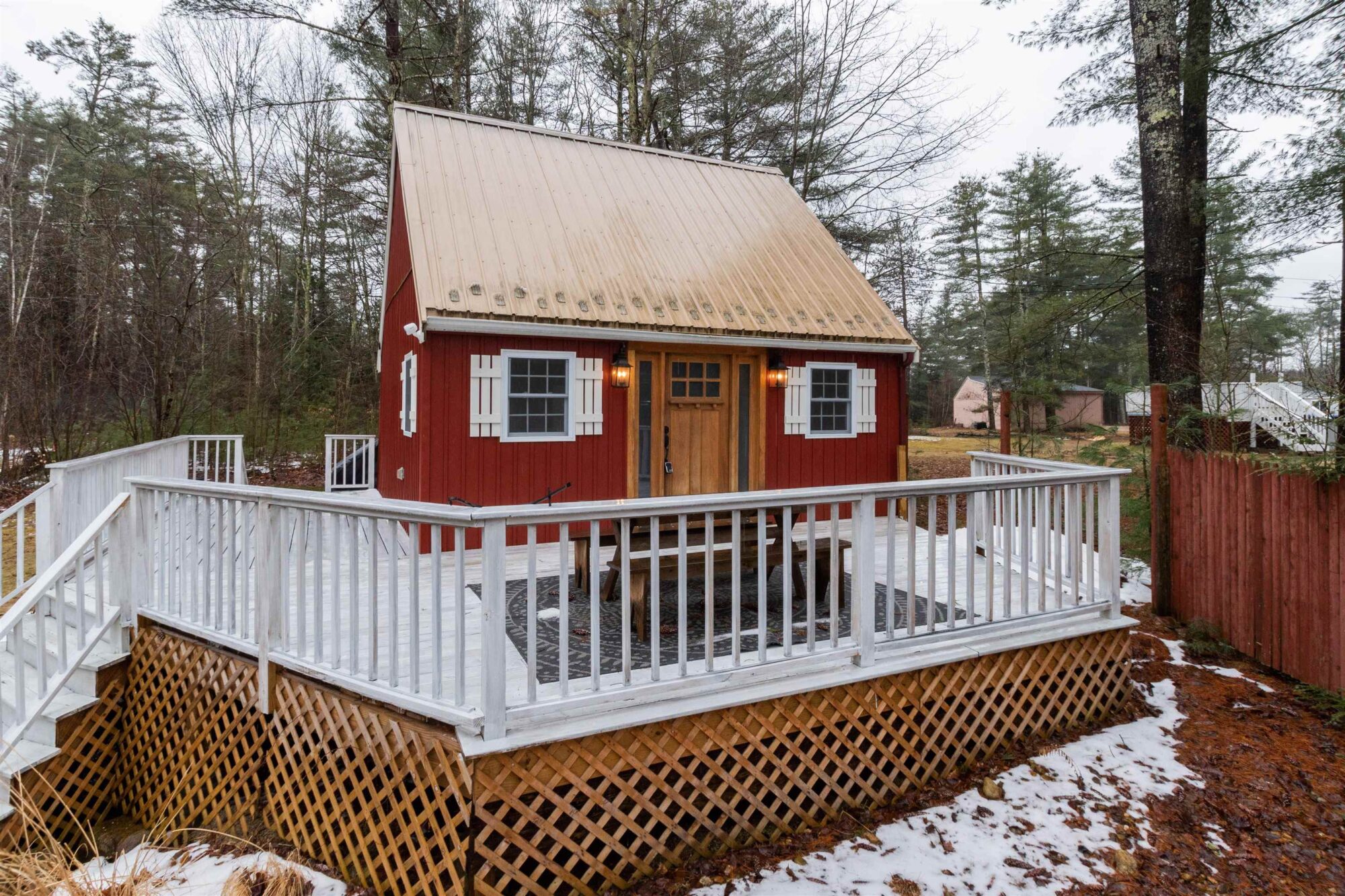 Calling all minimalist and nature lovers! This affordable property is cute as a button! 3a Coffeetown Rd is Located on a dirt road in the beautiful town of Deerfield NH. This open concept cottage is ready for its next owner. Cute kitchen with black stainless steel appliances, gas stove for cooking and butcher block countertop. The one bedroom that this property offers is a loft style bedroom that is open to below and has a large closet. There’s a large wrap around deck off of this property, which helps bring the outdoors in and expand your living space into the nature that surrounds. Fall asleep to the sounds of a babbling brook after enjoying a campfire.