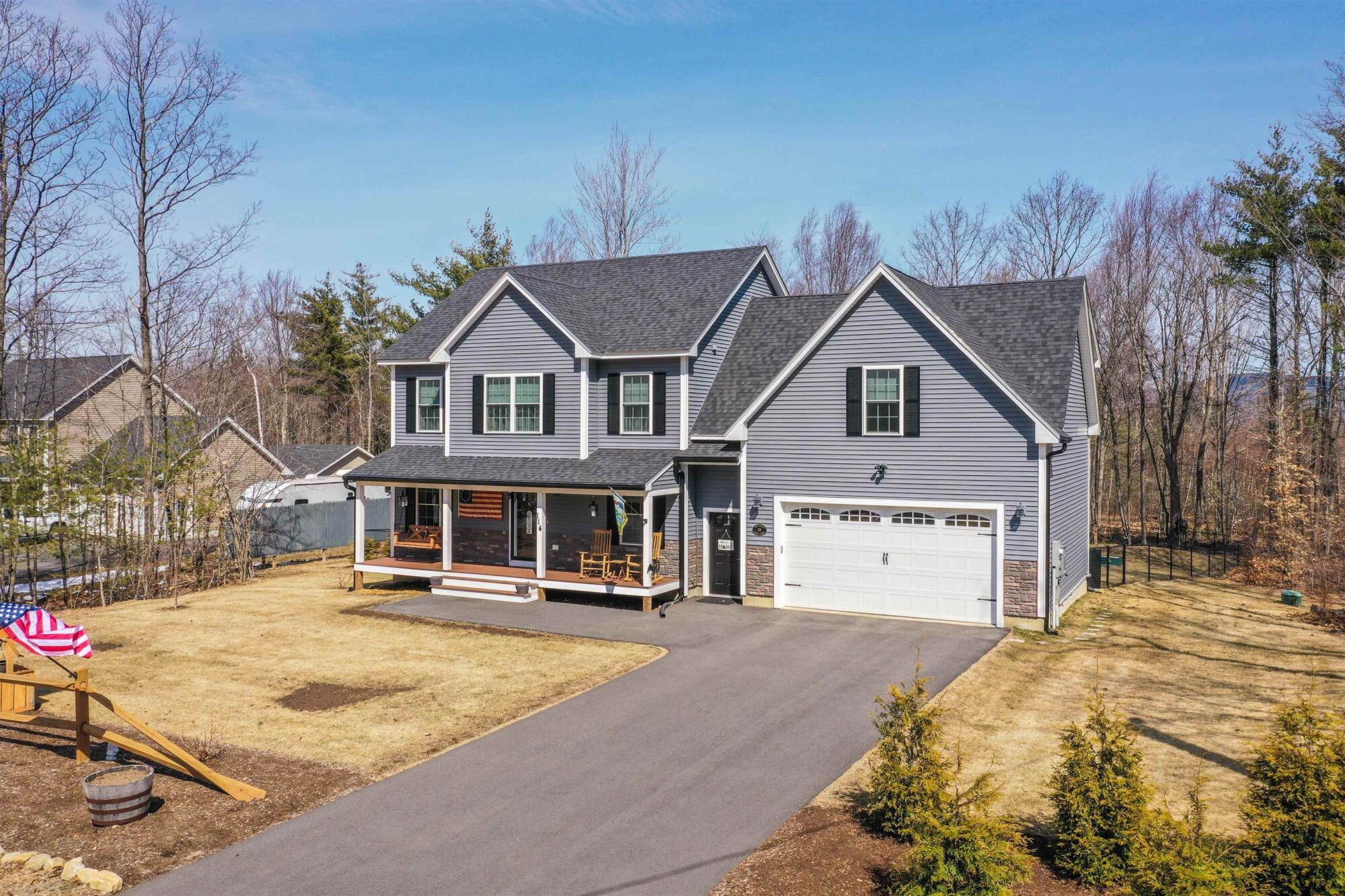 Lakes Region Living in Beautiful Belmont NH! This 3 year young custom colonial style home situated on an acre of land and surrounded by an outdoor enthusiasts dream! Close to area lakes, mountains and trail systems, there is something for everyone around this fine community. With 3-4 bedrooms, 3 baths and over 2200 sq ft of living space, there is plenty of room to spread out and relax! Features include: fenced yard, full front farmers porch, 2 car heated attached garage with HUGE bonus room above ideal for many uses, designer kitchen with granite and upgraded appliance package, OPEN CONCEPT living room / kitchen ideal for the entertainer in you, mudroom area off garage and fireplace for those chilly New England winter nights. As you head up to the second floor you will enjoy 3-4 bedrooms with a master suite with custom bathroom and the very convenient 2nd floor laundry! You also get rear deck for entertaining, hot tub feature w/ privacy fence, whole-house generator w/ surge protection, gutter system around house, hardwood, tile, central A/C, multi-zone heating / cooling w/ wifi capabilities, on-demand hot water system, heated walk-out lowerlevel for future expansion & ALL wall-mounted TV’s to stay! Why wait for New when almost New with an already mature lawn and yard is waiting for you! ENJOY!